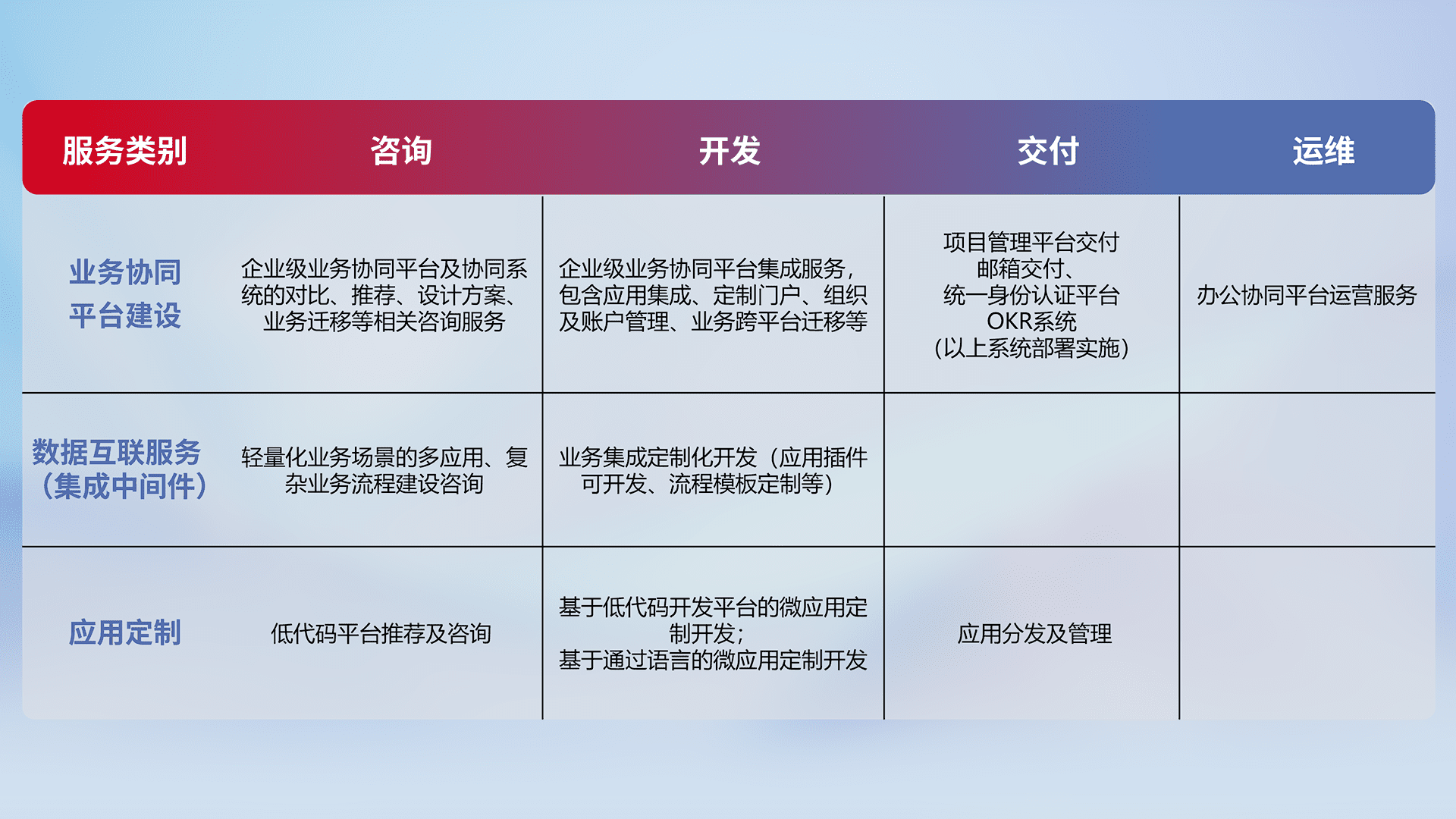 针对钉钉、、企微、、、IDaas等平台级产品提供产品的规划、、、方案、、、、交付、、、定制化开发等服务,,,,实现如统一协同办公、、、智能客户服务、、混合会议管理、、智能数据查询、、、、等业务场景,,,,实现数字化转型。。